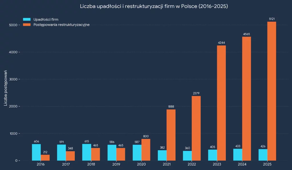 • Obserwujemy prawdziwą eksplozję restrukturyzacji: Od 2020 roku obserwujemy skokowy wzrost liczby restrukturyzacji, który w 2025 roku osiągnął rekordowy poziom 5121 przypadków.